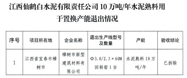 與此同時。江西工信廳另一則公示顯示,現(xiàn)用于江西仙鶴白水泥有限責(zé)任公司10萬噸/年水泥熟料產(chǎn)能置換的樟樹市新型建筑材料有限公司10萬噸/年水泥熟料生產(chǎn)線已按要求進(jìn)行了拆除,不具備水泥熟料生產(chǎn)條件,并通過現(xiàn)場核查驗收。