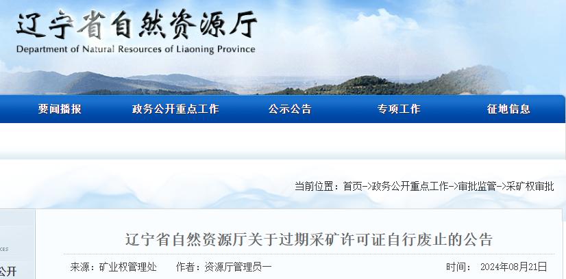 根據(jù)《礦產(chǎn)資源開采登記管理辦法》(國(guó)務(wù)院令第241號(hào))和《自然資源部關(guān)于進(jìn)一步完善礦產(chǎn)資源勘查開采登記管理的通知》(自然資規(guī)〔2023〕4號(hào))等有關(guān)規(guī)定,經(jīng)核實(shí),海城市旭益升菱鎂石采掘有限公司采礦許可證在有效期屆滿前未依法申請(qǐng)辦理延續(xù)登記手續(xù),采礦許可證自有效期屆滿之日起已經(jīng)自行廢止,現(xiàn)予以公告。