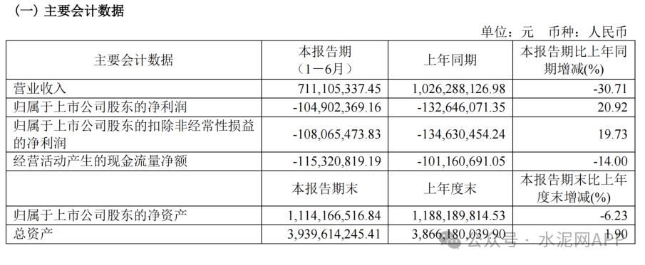 福建水泥8月23日晚間披露半年報(bào),2024年上半年實(shí)現(xiàn)營業(yè)收入7.11億元,同比下降30.71%;凈利潤虧損1.05億元,同比減虧。