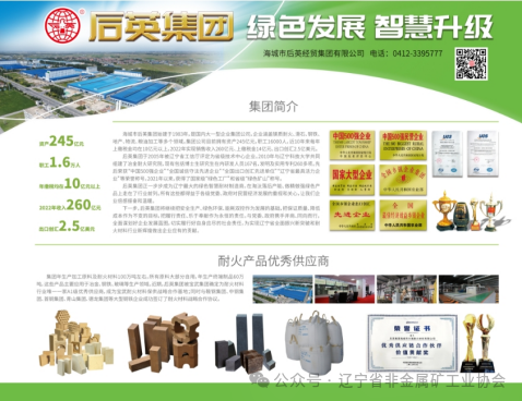 海城市后英集團(tuán)始建于1983年,是國內(nèi)大一型企業(yè)集團(tuán)公司,企業(yè)涵蓋鎂質(zhì)耐火、滑石、鋼鐵、地產(chǎn)、物流、糧油加工等多個(gè)領(lǐng)域。集團(tuán)公司目前擁有資產(chǎn)245億元,職工16000人,近10年來每年上繳稅金均在10億元以上。2022年實(shí)現(xiàn)銷售收入260億元、上繳稅金14億元、出口創(chuàng)匯2.5億美元。