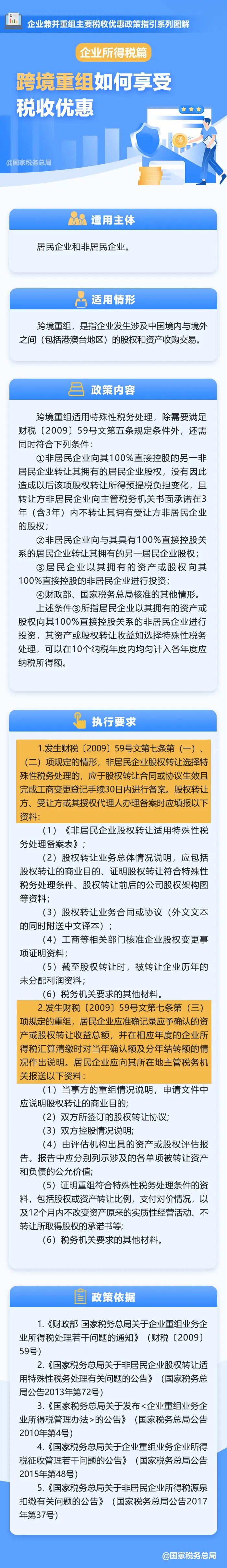 為引導(dǎo)企業(yè)正確適用兼并重組稅收政策,財(cái)政部、稅務(wù)總局等部門編寫了《企業(yè)兼并重組主要稅收優(yōu)惠政策指引》,對(duì)現(xiàn)行有效的支持企業(yè)兼并重組主要稅收優(yōu)惠政策和稅收征管文件進(jìn)行了梳理,并按照企業(yè)兼并重組的類型,分門別類明確了適用主體、適用情形、政策內(nèi)容、執(zhí)行要求及政策依據(jù)等內(nèi)容,為納稅人提供簡(jiǎn)明易行、獲得感強(qiáng)的操作指南。今天學(xué)習(xí):企業(yè)兼并重組企業(yè)所得稅優(yōu)惠政策——跨境重組如何享受稅收優(yōu)惠?