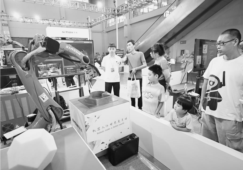 圖為制博會(huì)上,市民在新松公司展位前參觀(guān)。