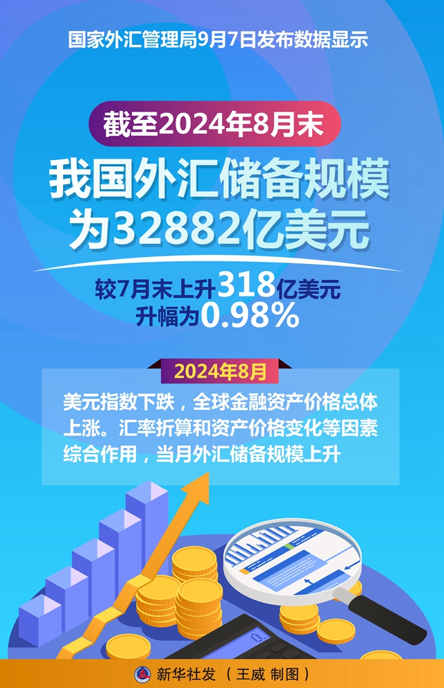 國家外匯管理局統(tǒng)計數(shù)據(jù)顯示:截至8月末,我國外匯儲備規(guī)模為32882億美元,較7月末上升318億美元,升幅為0.98%。8月,受主要經(jīng)濟體宏觀數(shù)據(jù)和貨幣政策預(yù)期等因素影響,美元指數(shù)下跌,全球金融資產(chǎn)價格總體上漲。匯率折算和資產(chǎn)價格變化等因素綜合作用,當月外匯儲備規(guī)模上升。