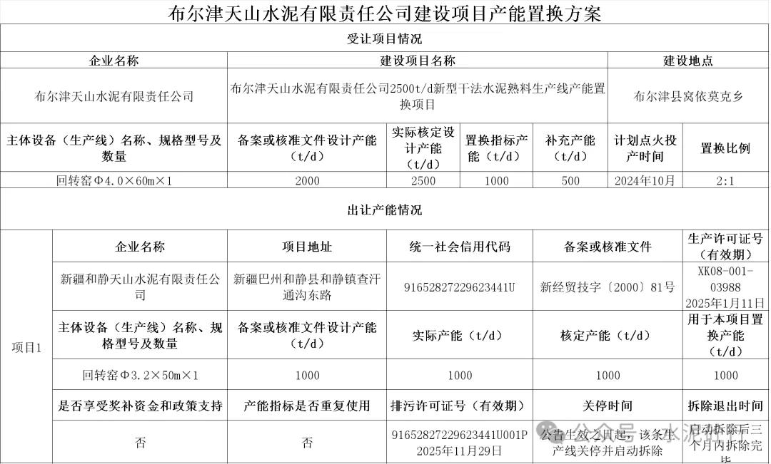 根據(jù)公示,布爾津天山水泥有限責(zé)任公司2500t/d新型干法水泥熟料生產(chǎn)線產(chǎn)能置換項目補(bǔ)充產(chǎn)能500t/d,置換比例2:1。