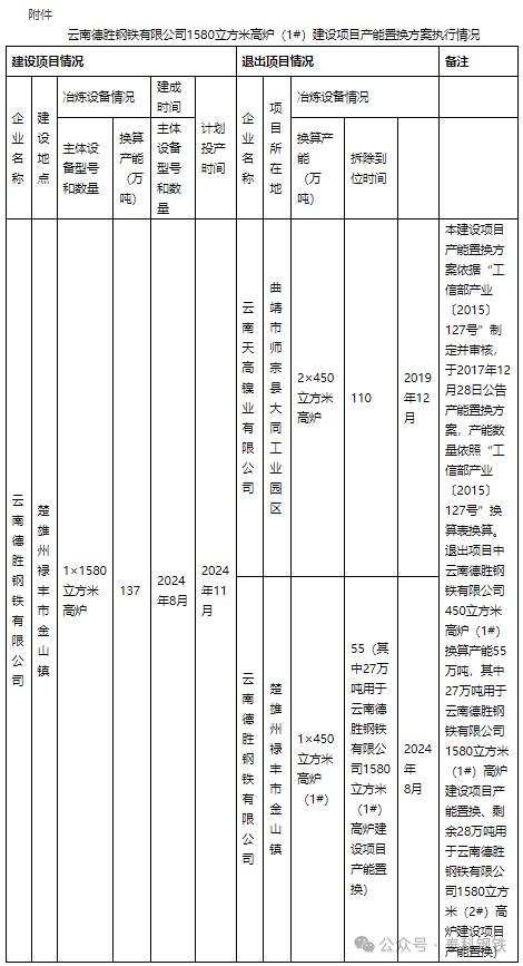 根據(jù)《國務(wù)院關(guān)于化解產(chǎn)能嚴(yán)重過剩矛盾的指導(dǎo)意見》(國發(fā)〔2013〕41號(hào))、《國務(wù)院關(guān)于鋼鐵行業(yè)化解過剩產(chǎn)能實(shí)現(xiàn)脫困發(fā)展的意見》(國發(fā)〔2016〕6號(hào))、《工業(yè)和信息化部關(guān)于印發(fā)部分產(chǎn)能嚴(yán)重過剩行業(yè)產(chǎn)能置換實(shí)施辦法的通知》(工信部產(chǎn)業(yè)〔2015〕127號(hào))文件精神,2017年12月28日云南省工業(yè)和信息化廳門戶網(wǎng)站發(fā)布了《云南德勝鋼鐵有限公司轉(zhuǎn)型升級(jí)改造項(xiàng)目產(chǎn)能等量置換方案》(云南省工業(yè)和信息化委員會(huì)公告2017年第20號(hào))。目前,該產(chǎn)能置換方案中1580立方米(1#)高爐已建成,為監(jiān)督落實(shí)產(chǎn)能置換方案公告后的執(zhí)行,根據(jù)企業(yè)申請(qǐng),在楚雄州工業(yè)和信息化局對(duì)云南德勝鋼鐵有限公司1580立方米高爐(1#)產(chǎn)能置換方案執(zhí)行情況完成州級(jí)核實(shí)驗(yàn)收的基礎(chǔ)上,云南省工業(yè)和信息化廳組織開展了省級(jí)驗(yàn)收?,F(xiàn)將《云南德勝鋼鐵有限公司轉(zhuǎn)型升級(jí)改造項(xiàng)目產(chǎn)能等量置換方案》(云南省工業(yè)和信息化委員會(huì)公告2017年第20號(hào))中1580立方米高爐(1#)產(chǎn)能置換方案執(zhí)行情況予以公告(詳見附件),歡迎社會(huì)公眾進(jìn)行監(jiān)督。聯(lián)系電話:0871-63512714、63512693。附件:云南德勝鋼鐵有限公司1580立方米高爐(1#)建設(shè)項(xiàng)目產(chǎn)能置換方案執(zhí)行情況