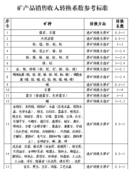 附件:礦產(chǎn)品銷售收入轉換系數(shù)參考標準