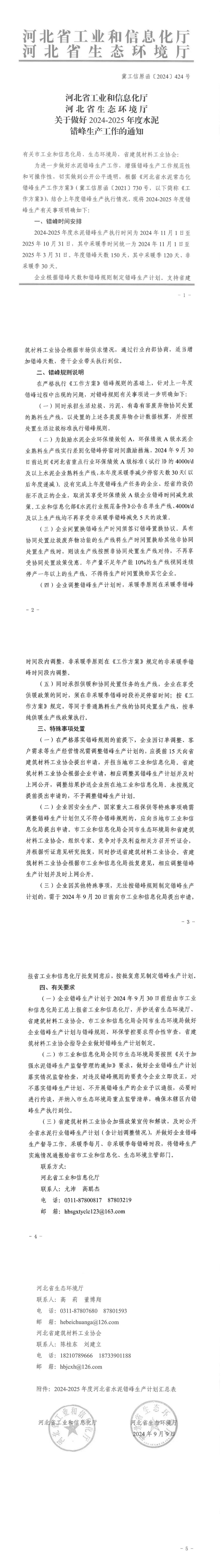 日前,河北省工業(yè)和信息化廳 河北省生態(tài)環(huán)境廳發(fā)布《關(guān)于做好2024-2025年度水泥錯峰生產(chǎn)工作的通知》要求,2024-2025年度水泥錯峰生產(chǎn)執(zhí)行時間為2024年11月1日至2025年10月31日,其中采暖季時間統(tǒng)一為2024年11月1日至2025年3月31日。年度錯峰天數(shù)150天,其中采暖季120天、非采暖季30天。