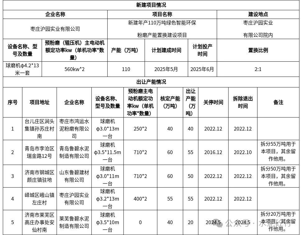 棗莊滬園實(shí)業(yè)有限公司新建年產(chǎn)110萬(wàn)噸水泥粉磨項(xiàng)目產(chǎn)能置換方案表