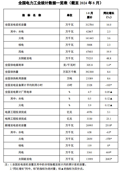 1—8月份,全國發(fā)電設(shè)備累計平均利用2328小時,比上年同期減少103小時。1-8月份,全國主要發(fā)電企業(yè)電源工程完成投資4976億元,同比增長5.1%。電網(wǎng)工程完成投資3330億元,同比增長23.1%。