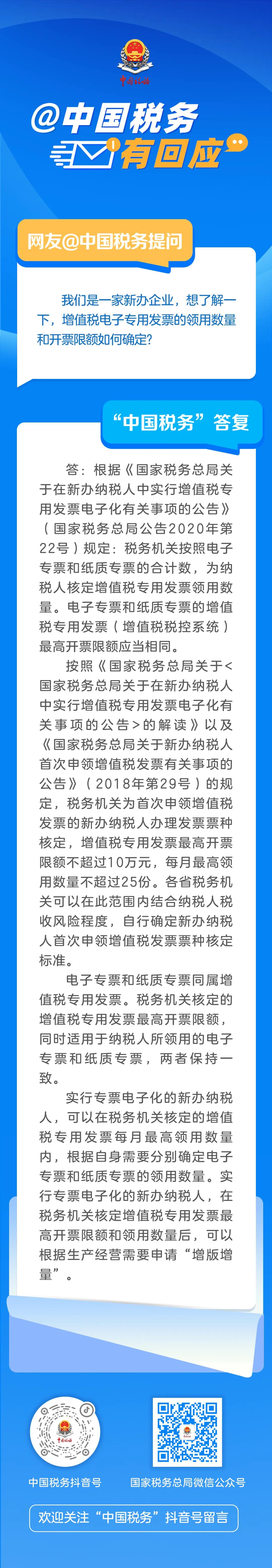 有網友提問:“我們是一家新辦企業(yè),想了解一下,增值稅電子專用發(fā)票的領用數量和開票限額是如何確定的?”一起來看看回復吧↓