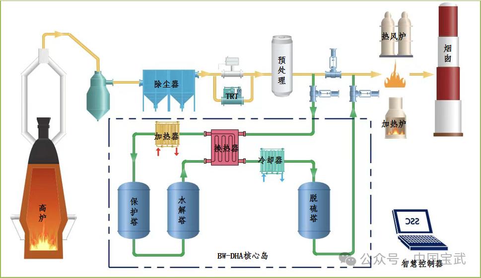 BW-DHA是寶武水務(wù)自主研發(fā)、具有獨(dú)立知識(shí)產(chǎn)權(quán)的高爐煤氣精脫硫源頭治理技術(shù),具備“高、低、長”三大特征,“高”指高效率、“低”指低能耗、“長”指長壽命。同時(shí),針對(duì)行業(yè)痛點(diǎn),寶武水務(wù)研發(fā)出的“煤氣調(diào)質(zhì)”“高活性抗毒水解劑”“熱量循環(huán)回收”“動(dòng)態(tài)控溫”“智慧運(yùn)行”等五大核心技術(shù)大大提升了煤氣的質(zhì)量,使其能夠更好地應(yīng)用于發(fā)電、加熱等環(huán)節(jié),提高能源利用效率,同時(shí)也減少了對(duì)周邊環(huán)境的影響。其中,煤氣調(diào)質(zhì)技術(shù)采用多級(jí)預(yù)處理,能有效去除高爐煤氣中的有害物質(zhì),延長水解劑的使用壽命,穩(wěn)定TRT(高爐煤氣余壓透平發(fā)電裝置)出口煤氣溫度。