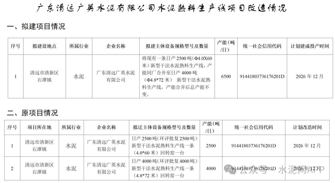 根據(jù)公示,廣東清遠(yuǎn)廣英水泥有限公司將現(xiàn)有一條日產(chǎn)2500噸(Φ4.0X60米)水泥熟料生產(chǎn)線,與同廠日產(chǎn)4000噸(Φ4.8*72米) 水泥熟料生產(chǎn)線合并擬建一條6500t/d熟料生產(chǎn)線,產(chǎn)能合并后總產(chǎn)能不變。項(xiàng)目計(jì)劃2026年12月投產(chǎn)。