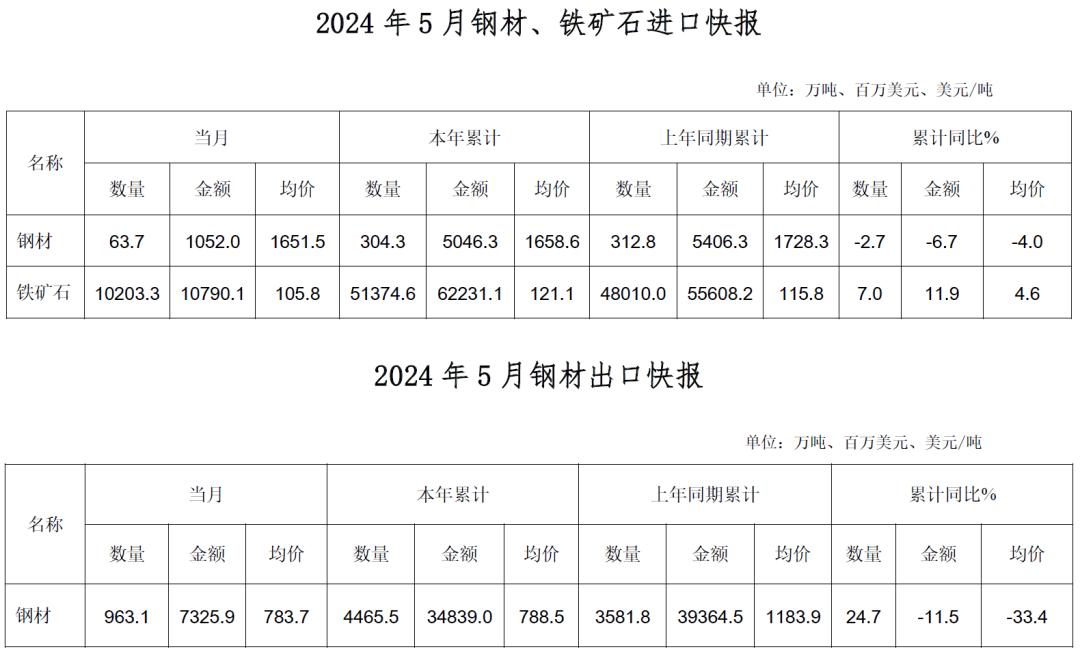 根據(jù)海關(guān)統(tǒng)計快訊數(shù)據(jù),2024年5月,我國進口鋼材63.7萬噸,環(huán)比減少2.1萬噸,下降3.2%;均價1651.5美元/噸,環(huán)比減少55.9美元/噸,下降3.3%。1-5月累計進口鋼材304.3萬噸,同比減少8.5萬噸,下降2.7%。