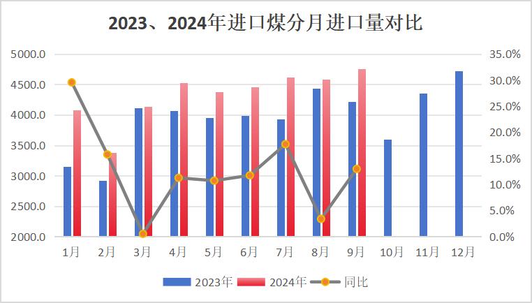 據(jù)中國海關(guān)總署最新數(shù)據(jù)顯示:2024年9月份我國煤及褐煤進口總量4758.8萬噸,同比增長13.0%;1-9月累計進口量38912.8萬噸,累計同比增長11.9%。