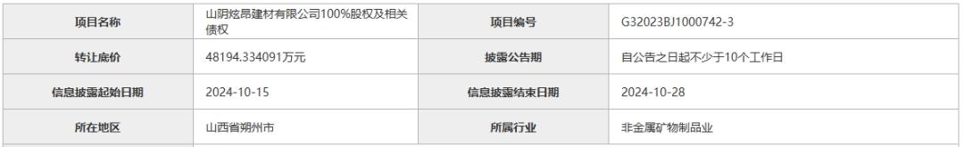 據(jù)某產(chǎn)權(quán)交易平臺(tái)顯示,山陰炫昂建材有限公司100%股權(quán)及相關(guān)債權(quán)轉(zhuǎn)讓,轉(zhuǎn)讓底價(jià)約4.8億元。