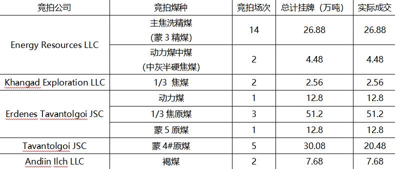 截至10月24日,據(jù)統(tǒng)計(jì)數(shù)據(jù)顯示,蒙古在10月共進(jìn)行了30場線上競拍,其中主流煤種Energy Resources LLC公司蒙3精煤共進(jìn)行了14場競拍,總計(jì)掛牌26.88萬噸,實(shí)際26.88萬噸;Tavantolgoi JSC公司蒙4在本月共進(jìn)行了5場競拍,總計(jì)掛牌30.08萬噸,實(shí)際成交20.48萬噸;Erdenes Tavantolgoi JSC公司在本月共進(jìn)行了5場競拍,總計(jì)掛牌76.8萬噸,實(shí)際成交76.8萬噸,其中ETT公司蒙5原煤時(shí)隔半年進(jìn)行線上競拍,掛牌12.8萬噸,全部成交,最后交貨時(shí)間2025年2月28日。