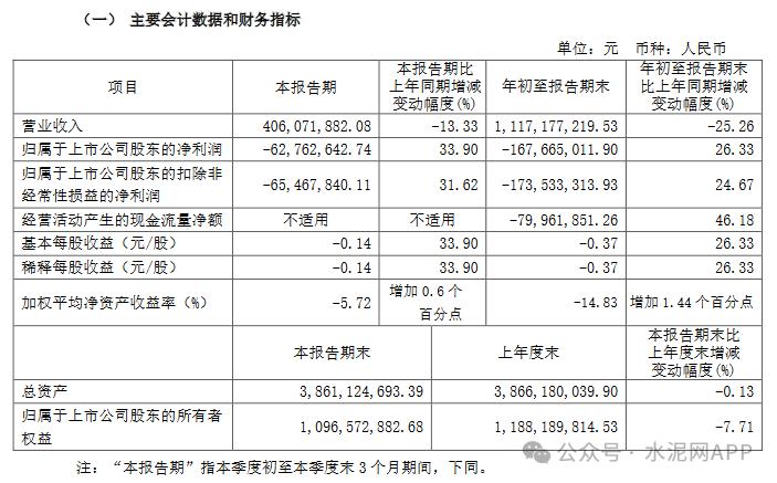 10月23日晚間,福建水泥披露2024年第三季度報(bào)告,報(bào)告期公司實(shí)現(xiàn)營(yíng)收11.17億元,同比下降25.26%;歸母凈利潤(rùn)虧損1.68億元,虧損同比縮小26.33%。
