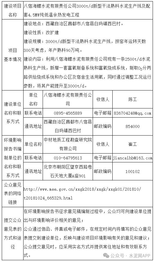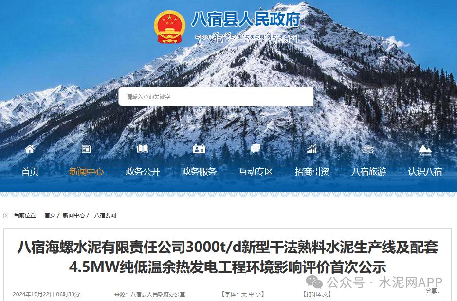日前,西藏八宿縣人民政府網(wǎng)站發(fā)布《八宿海螺水泥有限責(zé)任公司3000t/d新型干法熟料水泥生產(chǎn)線及配套4.5MW純低溫余熱發(fā)電工程環(huán)境影響評(píng)價(jià)首次公示》。