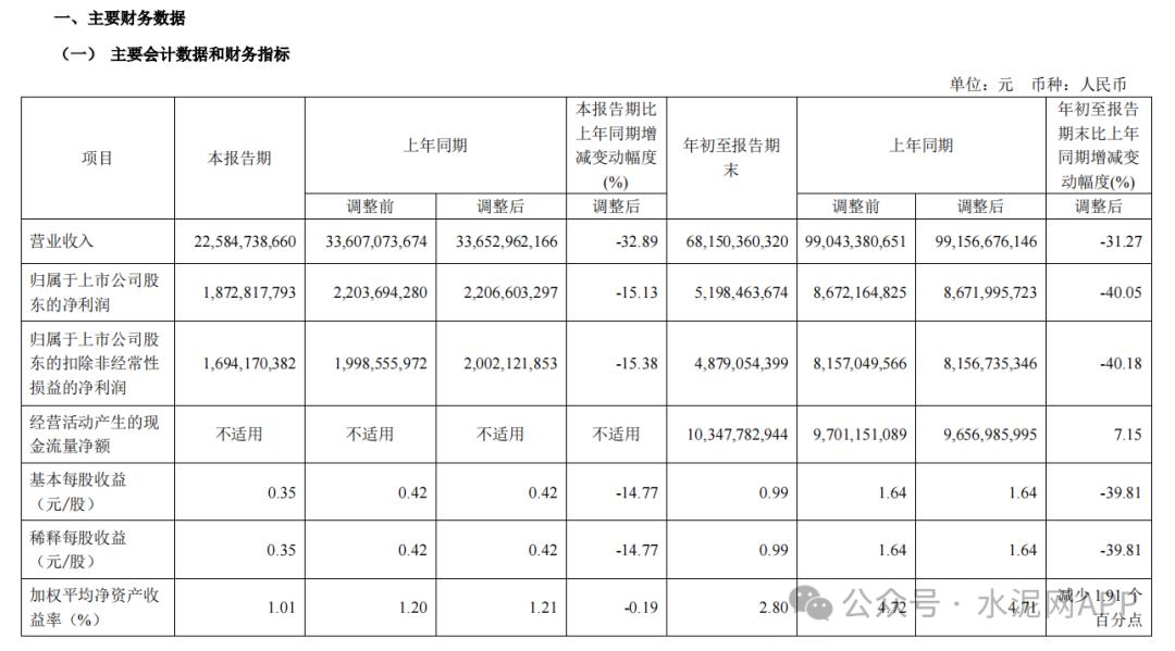 10月29日晚間,海螺水泥公告,公司前三季度營收為681.5億元,同比下降31.27%;凈利潤為51.98億元,同比下降40.05%;扣非歸母凈利潤為48.79億元,同比下降40.18%;基本每股收益0.99元。