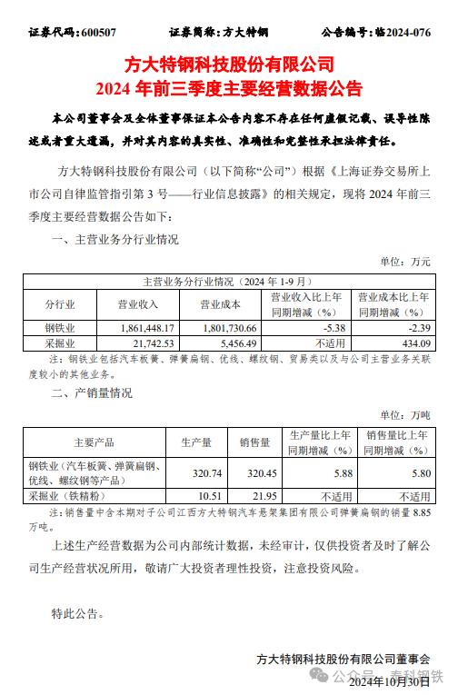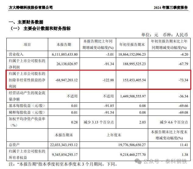 方大特鋼公告,第三季度營(yíng)收為61.12億元,同比下降3.01%;凈利潤(rùn)為2613.8萬元,同比下降91.34%。前三季度營(yíng)收為188.64億元,同比下降4.20%;凈利潤(rùn)為1.89億元,同比下降67.79%。