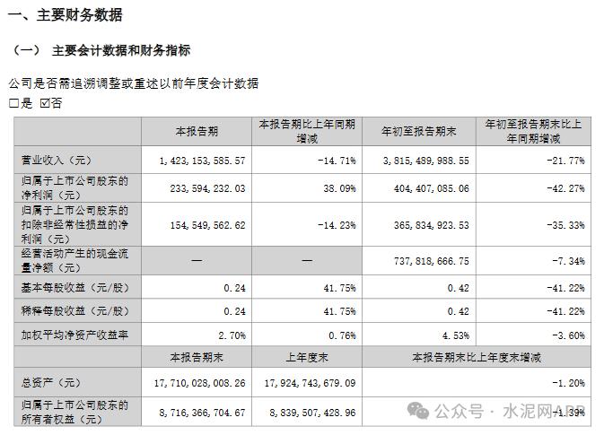 上峰水泥三季報顯示,公司前三季度累計實現(xiàn)營收38.15億元,同比下降21.77%;實現(xiàn)歸屬于上市公司股東的凈利潤4.04億元,同比下降42.27%。