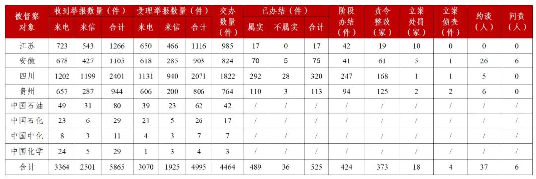 截至10月30日晚20:00,各督察組共收到群眾來電、來信舉報5865件,受理有效舉報4995件,經(jīng)梳理合并重復(fù)舉報,累計向被督察對象轉(zhuǎn)辦4464件;被督察對象已辦結(jié)或階段辦結(jié)949件,其中立案處罰18家;立案偵查4件;約談黨政領(lǐng)導(dǎo)干部37人,問責(zé)黨政領(lǐng)導(dǎo)干部6人。