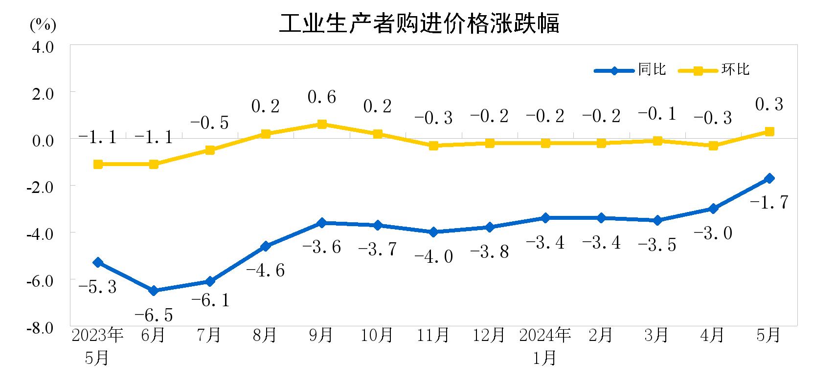 央視網(wǎng)消息:據(jù)國(guó)家統(tǒng)計(jì)局網(wǎng)站消息,2024年5月份,全國(guó)工業(yè)生產(chǎn)者出廠價(jià)格同比下降1.4%,降幅比上月收窄1.1個(gè)百分點(diǎn),環(huán)比上漲0.2%,上月為下降0.2%;工業(yè)生產(chǎn)者購(gòu)進(jìn)價(jià)格同比下降1.7%,環(huán)比上漲0.3%。1—5月平均,工業(yè)生產(chǎn)者出廠價(jià)格比上年同期下降2.4%,工業(yè)生產(chǎn)者購(gòu)進(jìn)價(jià)格下降3.0%。