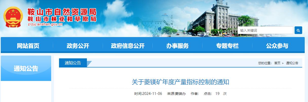 為貫徹落實《遼寧省推進菱鎂行業(yè)高質量發(fā)展實施意見》及《鞍山市推進菱鎂行業(yè)高質量發(fā)展實施方案》,根據礦產資源法律法規(guī)及《遼寧省菱鎂礦年度產量控制指標管理辦法(試行)》有關規(guī)定,強化我市菱鎂礦年度產量控制指標管理,保護和合理利用菱鎂礦產資源,推動科學合理、規(guī)范有序開發(fā)利用,現將關于菱鎂礦年度產量指標控制有關情況通知如下。