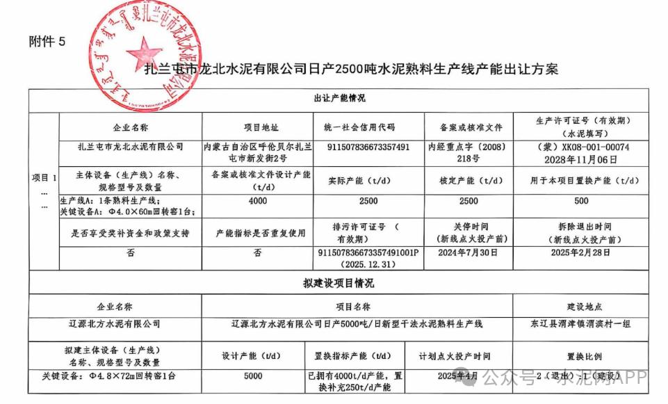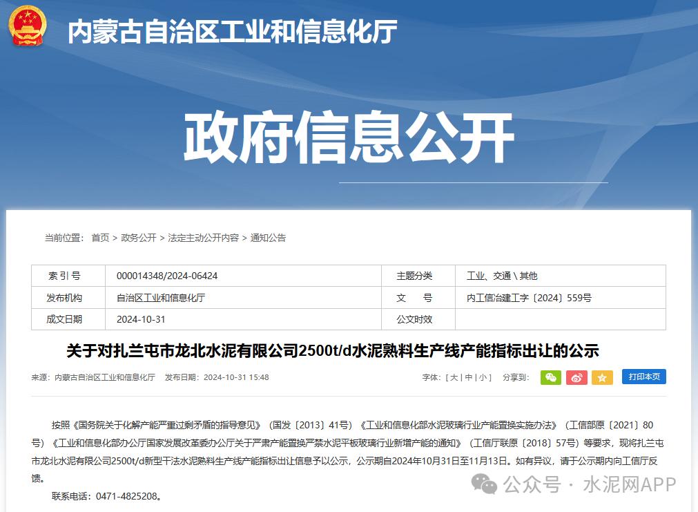 10月31日,內(nèi)蒙古工信廳發(fā)布“關(guān)于對扎蘭屯市龍北水泥有限公司2500t/d水泥熟料生產(chǎn)線產(chǎn)能指標(biāo)出讓的公示”。