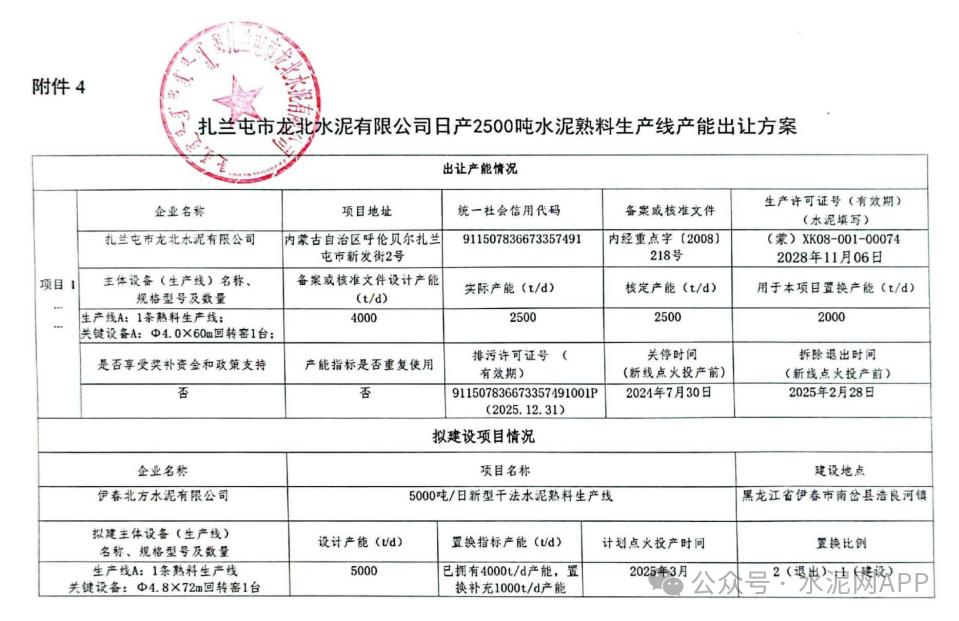 公示顯示,扎蘭屯市龍北水泥有限公司2500t/d水泥熟料生產(chǎn)線2000t/d產(chǎn)能出讓給伊春北方水泥有限公司5000t/d擬建項目;500t/d產(chǎn)能出讓給遼源北方水泥有限公司5000t/d擬建項目,置換比例均為2:1,分別計劃于2025年3月和4月投產(chǎn)。伊春北方水泥有限公司5000t/d擬建項目已擁有4000t/d產(chǎn)能,置換補充1000t/d產(chǎn)能;遼源北方水泥有限公司5000t/d擬建項目已擁有4000t/d產(chǎn)能,置換補充250t/d產(chǎn)能。