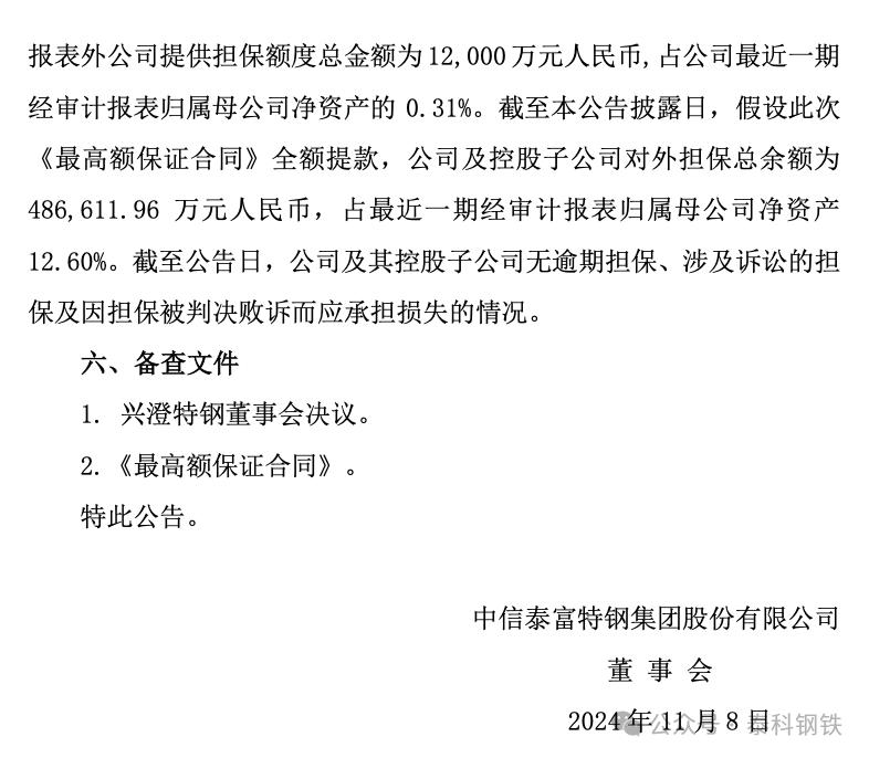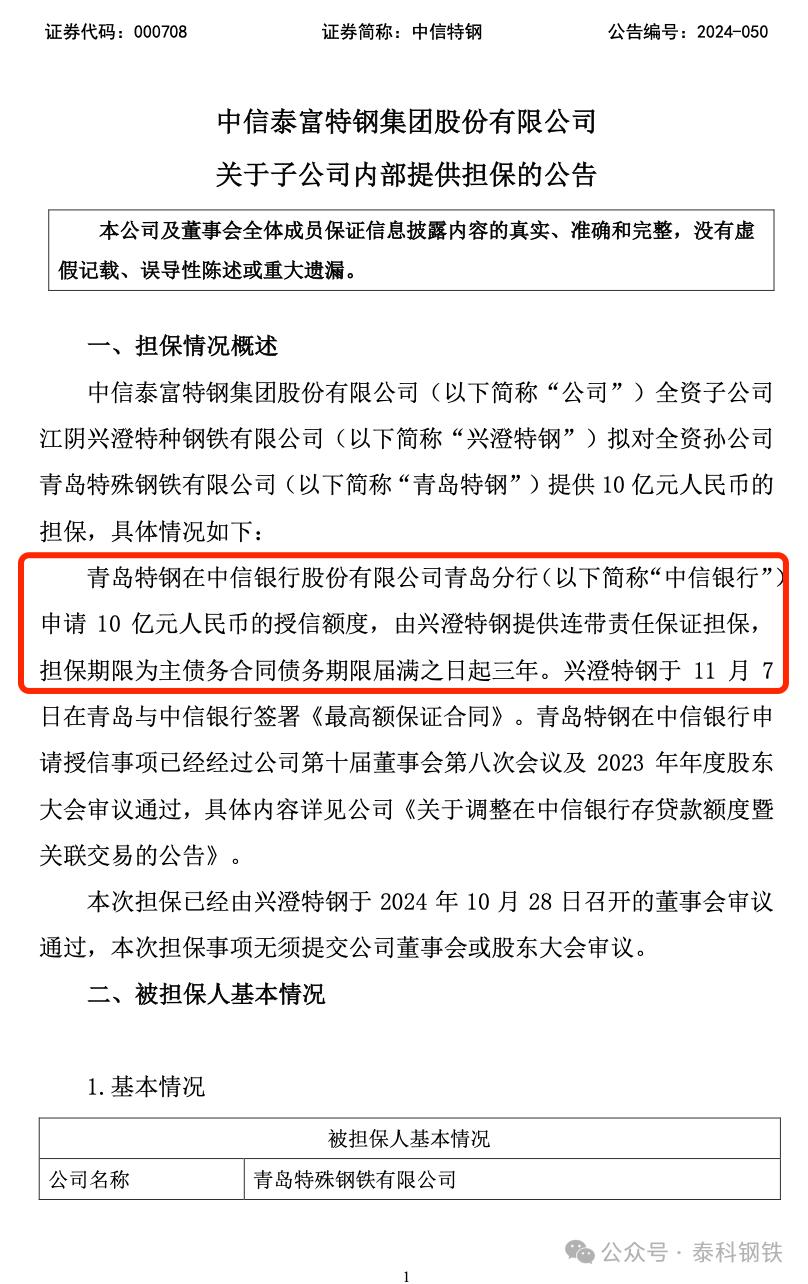 中信特鋼11月8日發(fā)布關(guān)于子公司內(nèi)部提供擔(dān)保的公告。公司全資子公司興澄特鋼擬對(duì)其全資孫公司青島特鋼提供10億元人民幣的擔(dān)保,以支持青島特鋼在中信銀行申請(qǐng)的授信額度。擔(dān)保期限為主債務(wù)合同債務(wù)期限屆滿之日起三年,相關(guān)合同已于11月7日簽署。