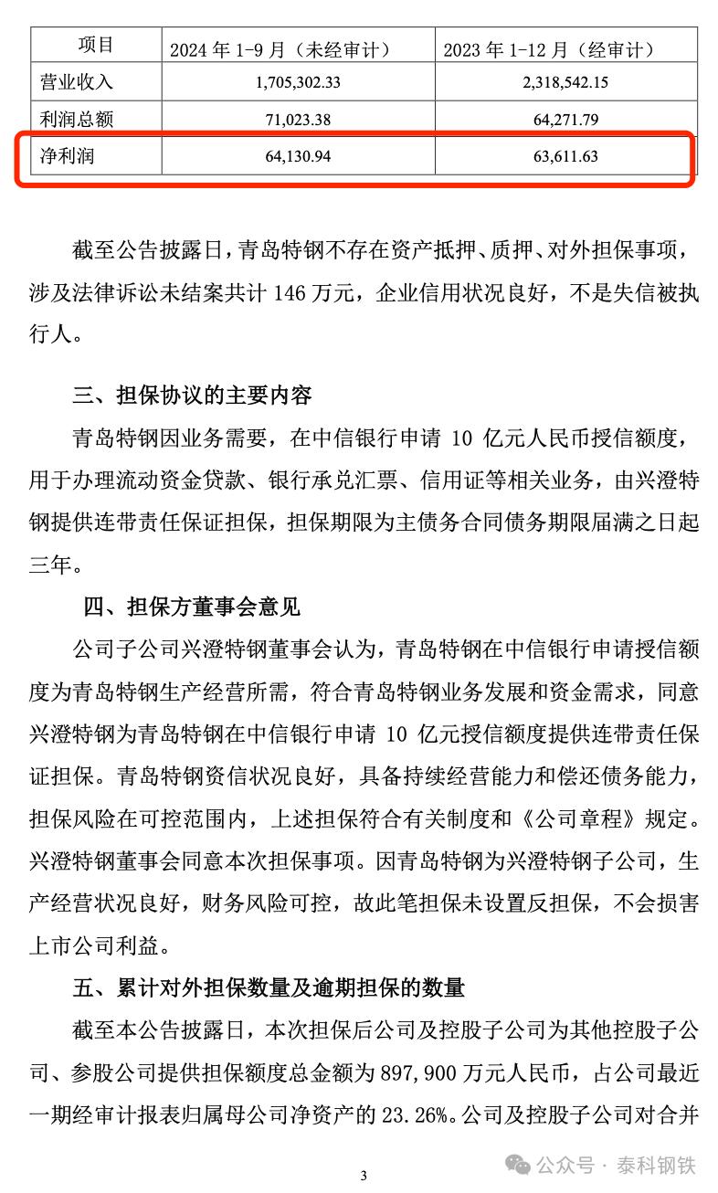 截至2024年9月30日,青島特鋼的資產(chǎn)總額為227.45億元,負(fù)債總額為145.52億元,凈資產(chǎn)為81.93億元,銀行貸款總額為64.9億元。青島特鋼的營(yíng)業(yè)收入為170.53億元,凈利潤(rùn)為6.41億元。公司及控股子公司為其他控股子公司、參股公司提供的擔(dān)保額度總金額為89.79億元,占最近一期經(jīng)審計(jì)報(bào)表歸屬母公司凈資產(chǎn)的23.26%。此次擔(dān)保未設(shè)置反擔(dān)保,董事會(huì)認(rèn)為風(fēng)險(xiǎn)可控,不會(huì)損害上市公司利益。