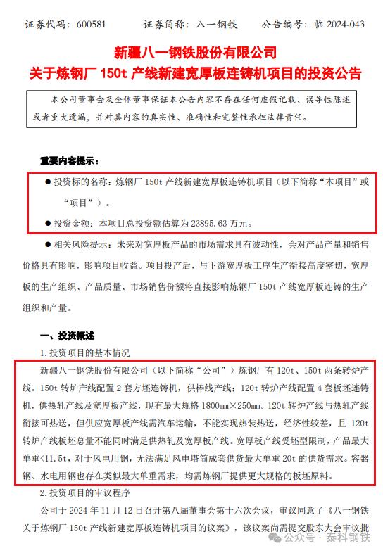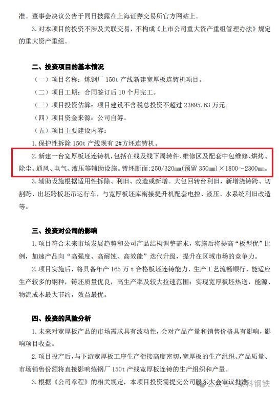 八一鋼鐵11月12日公告,公司擬投資不超過2.39億元建設(shè)煉鋼廠150t產(chǎn)線新建寬厚板連鑄機(jī)項(xiàng)目,合同簽訂后10個月完工。建設(shè)內(nèi)容包括保護(hù)性拆除150t產(chǎn)線現(xiàn)有2#方坯連鑄機(jī);新建一臺寬厚板坯連鑄機(jī),包括在線及線下周轉(zhuǎn)件、維修區(qū)及配套中包維修、烘烤、除塵、通風(fēng)、電氣、液壓等輔助設(shè)施。