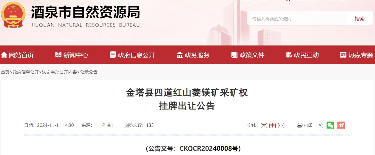 獲取掛牌文件的途徑:獲取招標(biāo)/拍賣/掛牌文件的途徑:申請(qǐng)人自本公告發(fā)布之日起到酒泉市自然資源局、酒泉市公共資源交易中心及甘肅甘肅盛鵬源拍賣有限公司領(lǐng)取《金塔縣四道紅山菱鎂礦采礦權(quán)掛牌出讓文件》