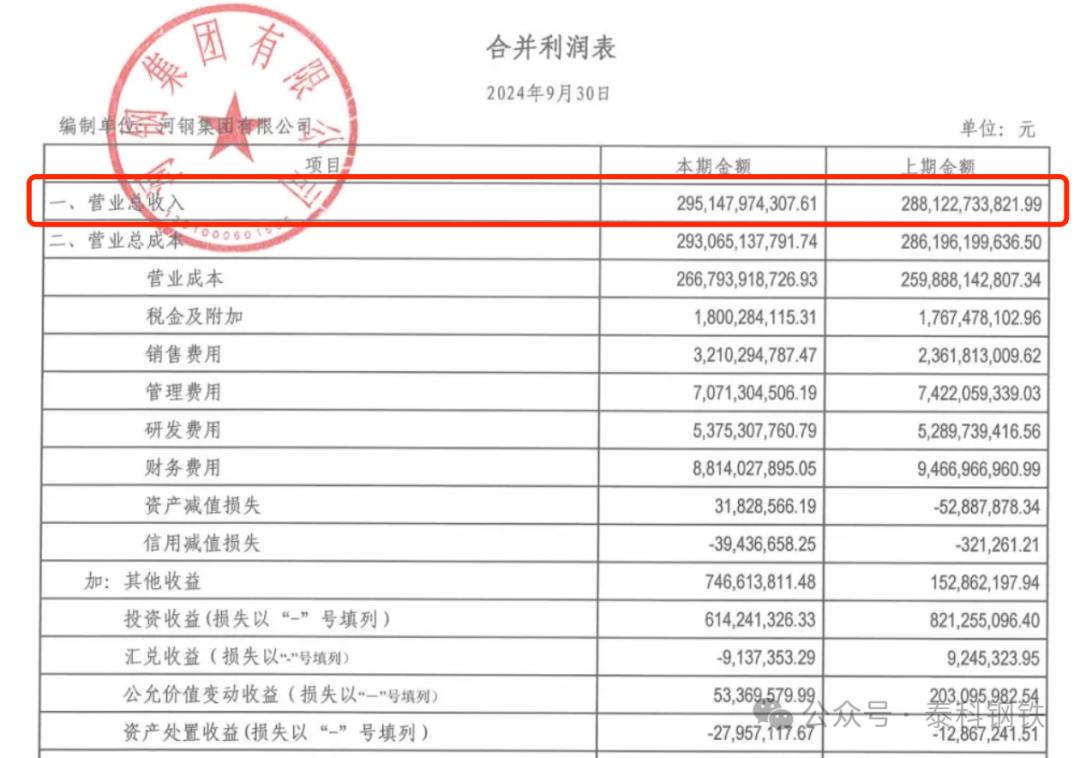 近日,河鋼集團有限公司2024年三季度合并及母公司財務(wù)報表公布,河鋼集團2024年1-9月營收2951.48億元(2023年同期2881.23億元),凈利潤18.21億元(2023年同期16.61億元),同比均逆勢增長!
