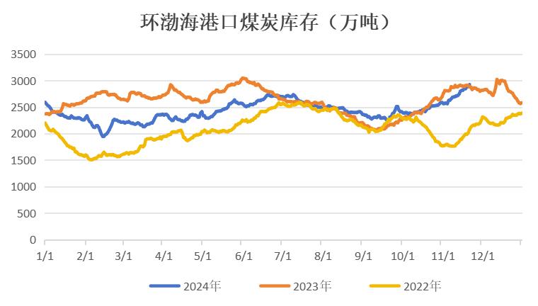 近期國內(nèi)煤炭供應(yīng)持續(xù)高位,進入冬季用煤高峰,政府表態(tài)要求推進煤炭保供工作,12月份國內(nèi)煤炭供應(yīng)仍有增量空間。大秦線秋季檢修結(jié)束后,鐵路運輸能力充足釋放,持續(xù)保持發(fā)運量高位,港口輸入量多、消耗量少,煤炭庫存持續(xù)升高。截至目前,環(huán)渤海港口庫存總庫存2924.6萬噸,已近逼近3000萬噸大關(guān),位于同期較高水平。當前全國統(tǒng)調(diào)電廠存煤保持在2億噸以上、平均可用超過30天,終端整體庫存充足,補貨意愿不強。非電行業(yè)也沒有有力支撐,所以僅僅維持剛需采購。