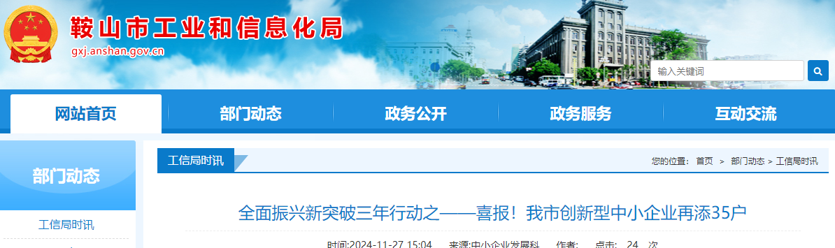 近日,遼寧省工業(yè)和信息化廳官方網(wǎng)站發(fā)布遼寧省創(chuàng)新型中小企業(yè)名單(2024年第三批),鞍山市35戶企業(yè)獲此殊榮。獲評企業(yè)中,滿分企業(yè)1戶,80分以上企業(yè)12戶,高新技術(shù)企業(yè)31戶,擁有省部級以上研發(fā)機(jī)構(gòu)的企業(yè)2戶,知識產(chǎn)權(quán)優(yōu)勢企業(yè)1戶。截至目前,全市已有創(chuàng)新型中小企業(yè)216戶,標(biāo)志著鞍山市優(yōu)質(zhì)中小企業(yè)梯度培育工作初見成效。