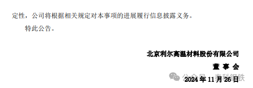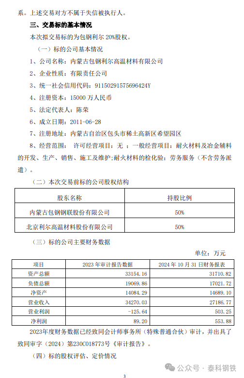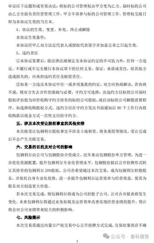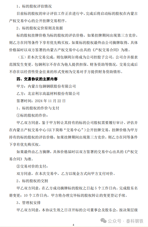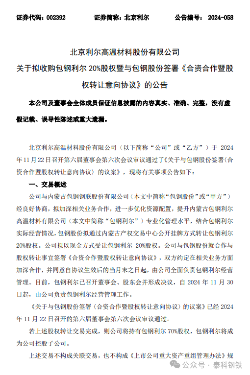 北京利爾11月25日晚間公告,公司與包鋼股份擬加深相關(guān)業(yè)務(wù)合作,包鋼股份擬公開掛牌轉(zhuǎn)讓內(nèi)蒙古包鋼利爾高溫材料有限公司(簡(jiǎn)稱“包鋼利爾”)20%股權(quán),公司擬以現(xiàn)金受讓包鋼利爾20%股權(quán)。公司與包鋼股份就此簽署意向協(xié)議,雙方約定在相關(guān)業(yè)務(wù)方面加深合作,并同意自協(xié)議生效后的當(dāng)月末之日起,由公司全面負(fù)責(zé)包鋼利爾經(jīng)營(yíng)管理。若此次交易完成,公司將持有包鋼利爾70%股權(quán),包鋼利爾將成為公司控股子公司。