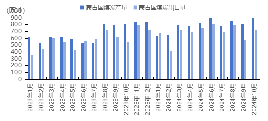 據(jù)蒙古國國家統(tǒng)計(jì)辦公室發(fā)布最新統(tǒng)計(jì)數(shù)據(jù)顯示,10月蒙古國原煤產(chǎn)量893.9萬噸,同比增速達(dá)10.88%,較上月806萬噸相比增加87.9萬噸,環(huán)比增速10.91%。2024年1-10月蒙古國煤炭產(chǎn)量累計(jì)為8109.58萬噸,較上年同期相比增加1661.7萬噸,同比增長25.8%。其中,硬煤(Hard coal)產(chǎn)量累計(jì)6964.6萬噸,同比增長26.1%;褐煤(Brown coal)產(chǎn)量累計(jì)1144.9萬噸,同比增長23.7%。根據(jù)蒙古國海關(guān)外貿(mào)統(tǒng)計(jì)報(bào)告數(shù)據(jù)顯示,2024年1-10月蒙古已累計(jì)出口煤炭6849.34萬噸,較上年同期相比增加1409.61萬噸,增速達(dá)25.9%。其中,10月蒙古煤炭出口量達(dá)727.44萬噸,同比增加33%,環(huán)比增加25.1%。