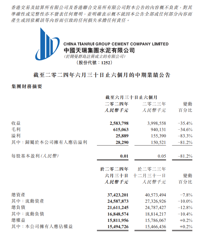 12月1日,中國(guó)天瑞水泥發(fā)布2024年中期業(yè)績(jī),該集團(tuán)取得收益人民幣25.84億元,同比減少35.4%;歸屬于公司擁有人的應(yīng)占溢利2829萬(wàn)元,同比減少81.2%;每股基本盈利0.01元。來(lái)自銷售水泥的收益約為18.7億元,較2023年同期約30.78億元,降幅為39.2%。集團(tuán)的水泥銷量由2023年上半年的約1200萬(wàn)噸減少380萬(wàn)噸至2024年同期的約820萬(wàn)噸,降幅為31.4%。收益減少主要是由于水泥銷量以及銷價(jià)同時(shí)減少所致。