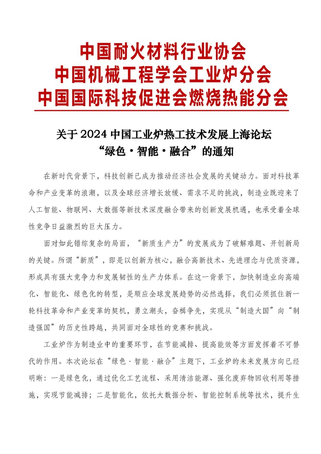 中耐協(xié):關(guān)于2024 中國工業(yè)爐熱工技術(shù)發(fā)展上海論壇“綠色·智能·融合”的通知