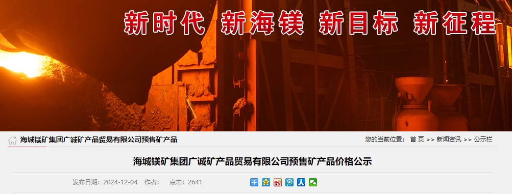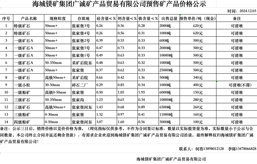 海鎂集團(tuán)廣誠礦產(chǎn)品貿(mào)易有限公司預(yù)售礦產(chǎn)品價格公示