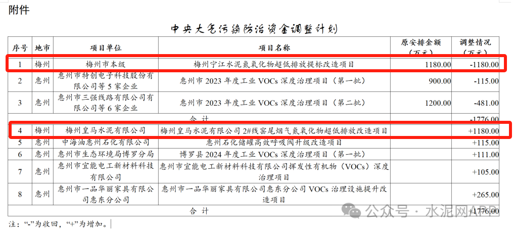 公示顯示,收回原安排梅州寧江水泥氮氧化物超低排放提標(biāo)改造項(xiàng)目資金1180萬(wàn)元。