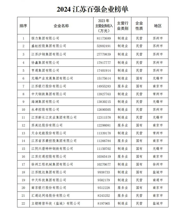 近日,江蘇省企業(yè)聯(lián)合會(huì)發(fā)布2024江蘇營業(yè)收入百強(qiáng)企業(yè)榜單。據(jù)了解,2023年,江蘇百強(qiáng)企業(yè)實(shí)現(xiàn)營業(yè)收入72861.16億元,平均每家入榜企業(yè)營業(yè)收入規(guī)模達(dá)到728.61億元。其中,恒力集團(tuán)有限公司、盛虹控股集團(tuán)有限公司和江蘇沙鋼集團(tuán)有限公司,位列2024江蘇營業(yè)收入百強(qiáng)企業(yè)榜的前三強(qiáng)。