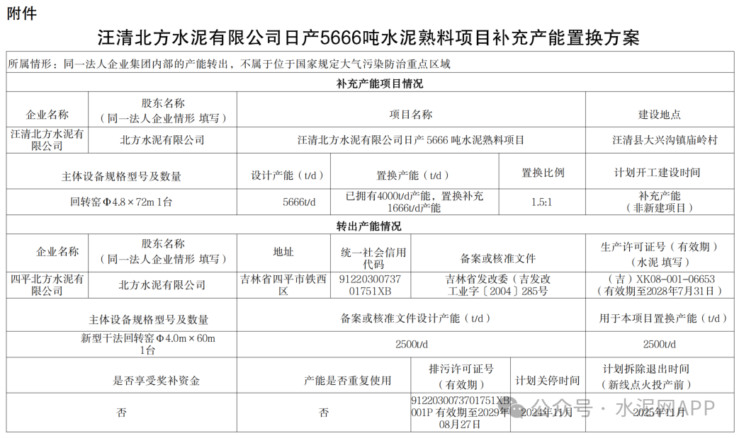 文件顯示,四平北方水泥有限公司退出一條2500t/d熟料生產(chǎn)線,用于汪清北方水泥有限公司置換補(bǔ)充1666t/d產(chǎn)能,置換補(bǔ)充后生產(chǎn)線達(dá)到5666t/d熟料,置換比例1.5:1。