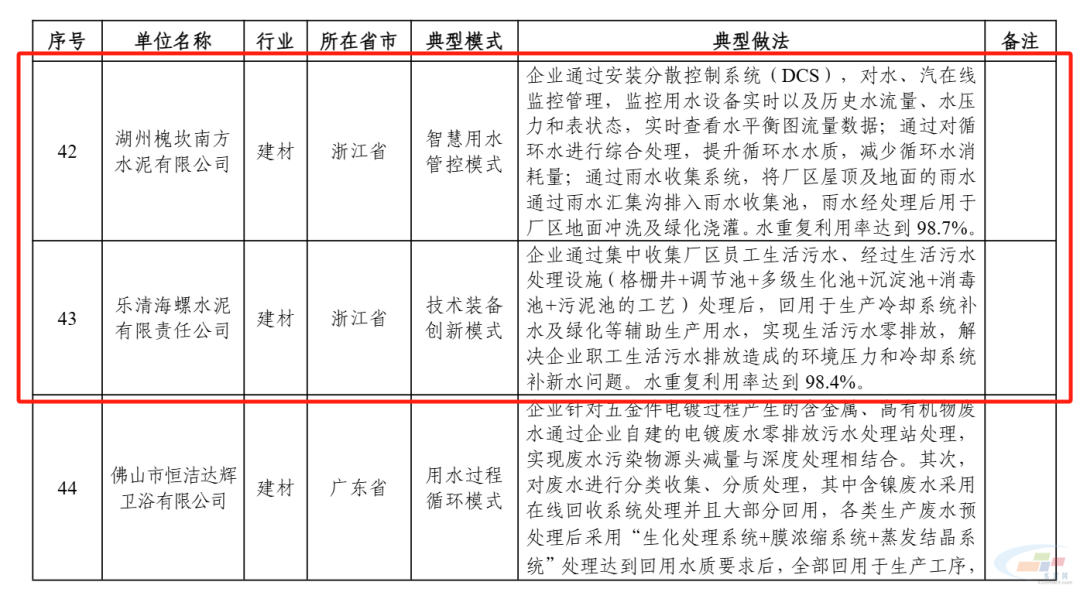 水泥行業(yè),湖州槐坎南方水泥有限公司的“智慧用水管控模式”;樂清海螺水泥有限責(zé)任公司的“技術(shù)裝備創(chuàng)新模式”被列入2024年工業(yè)廢水循環(huán)利用典型案例名單。