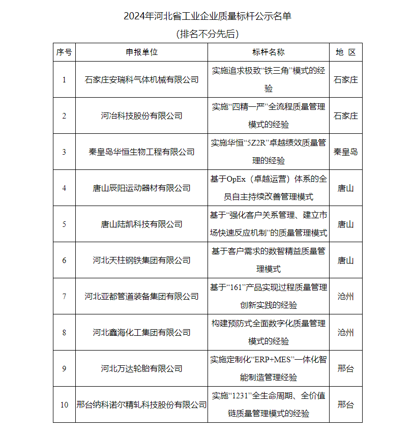 關(guān)于2024年河北省工業(yè)企業(yè)質(zhì)量標(biāo)桿名單的公示