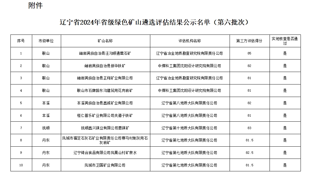 附件:遼寧省2024年省級(jí)綠色礦山遴選評(píng)估結(jié)果公示名單(第六批次)