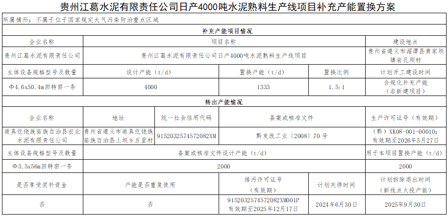 12月16日,貴州省工信廳公示貴州江葛水泥有限責任公司日產(chǎn)4000噸水泥熟料生產(chǎn)線項目補充產(chǎn)能置換方案。
