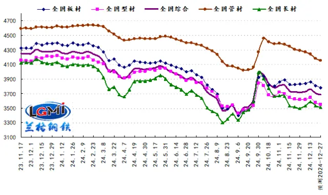 2024年第51周(2024.12.16-12.20)蘭格鋼鐵全國絕對(duì)價(jià)格指數(shù)為3708元,較上周下降1.2%,較去年同期下降12.9%;其中,蘭格鋼鐵長材絕對(duì)價(jià)格指數(shù)為3535元,較上周下降1.2%,較去年同期下降13.9%;蘭格鋼鐵型材絕對(duì)價(jià)格指數(shù)為3574元,較上周下降1.9%,較去年同期下降14.3%;蘭格鋼鐵板材絕對(duì)價(jià)格指數(shù)為3811元,較上周下降1.1%,較去年同期下降12.6%;蘭格鋼鐵管材絕對(duì)價(jià)格指數(shù)為4177元,較上周下降1.5%,較去年同期下降9.2%。